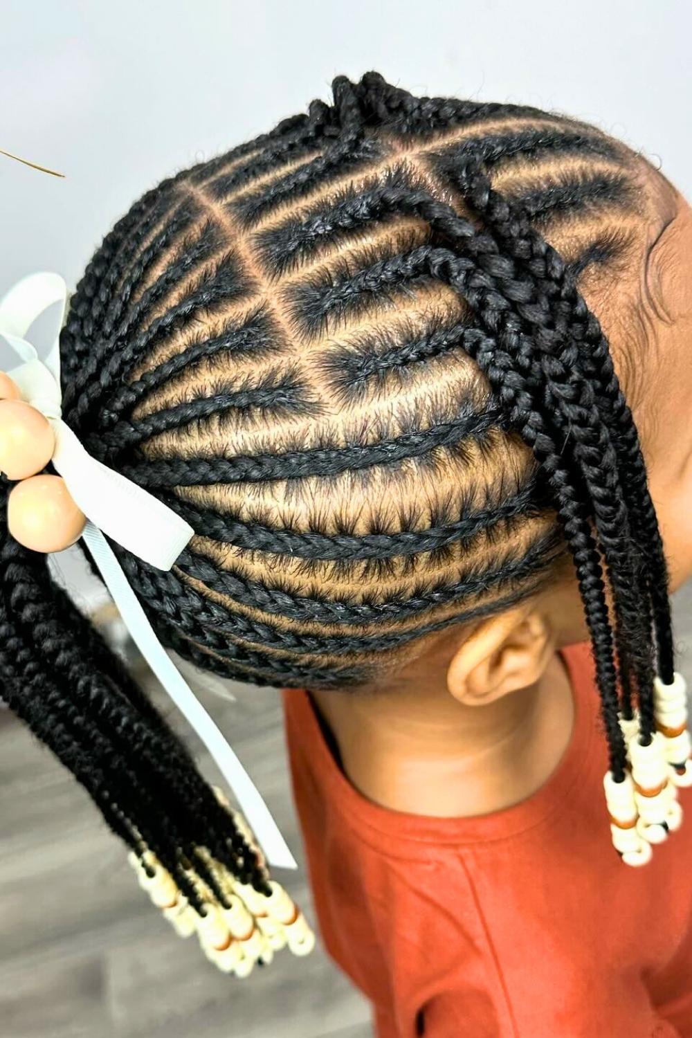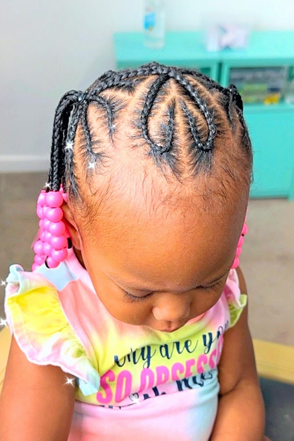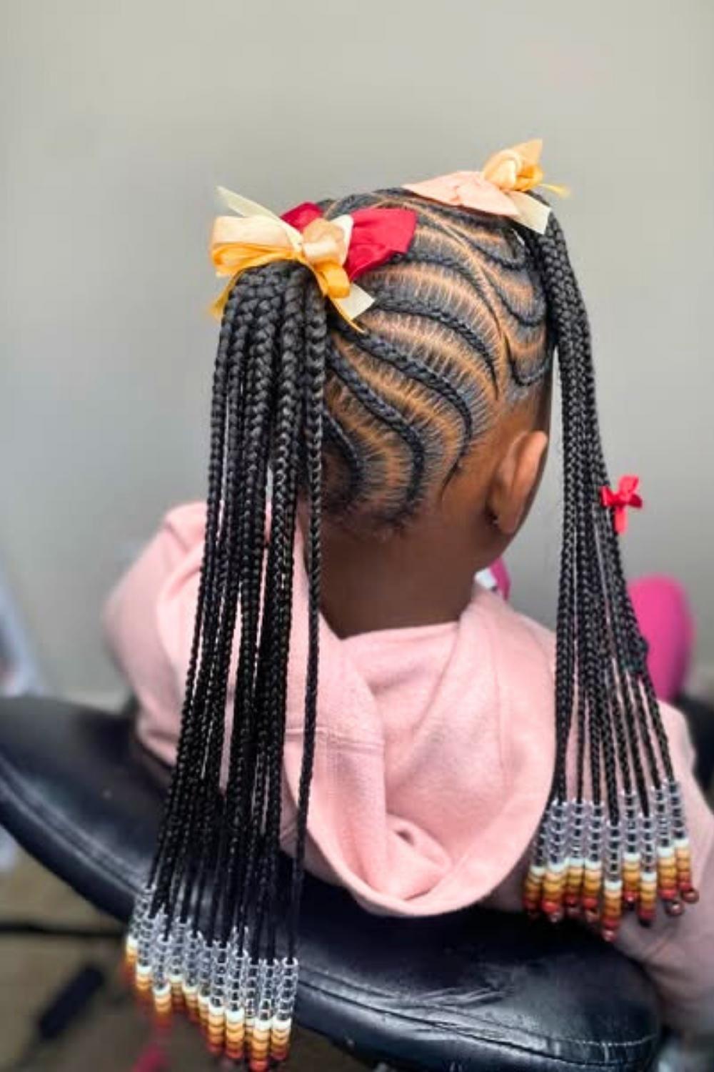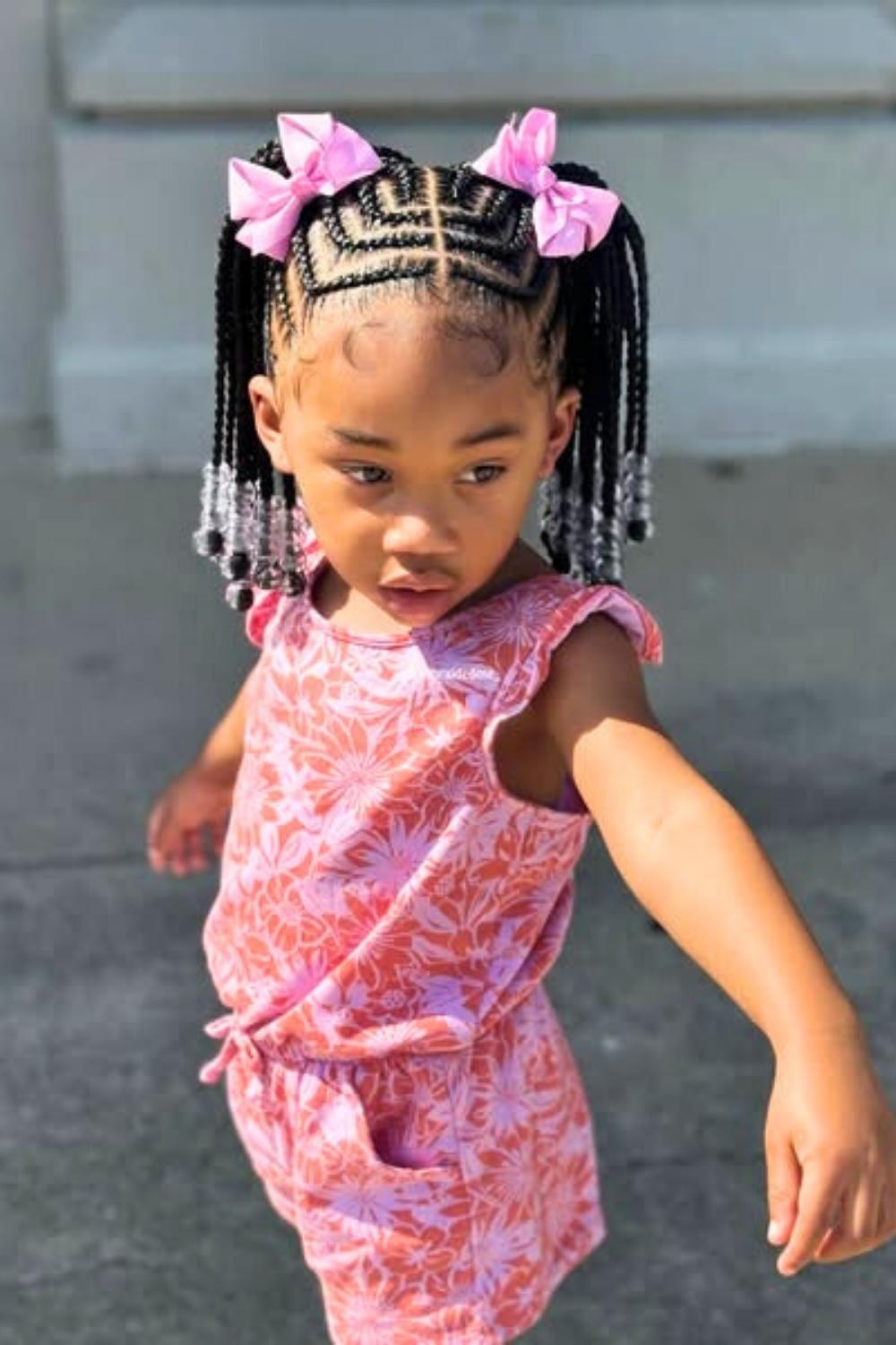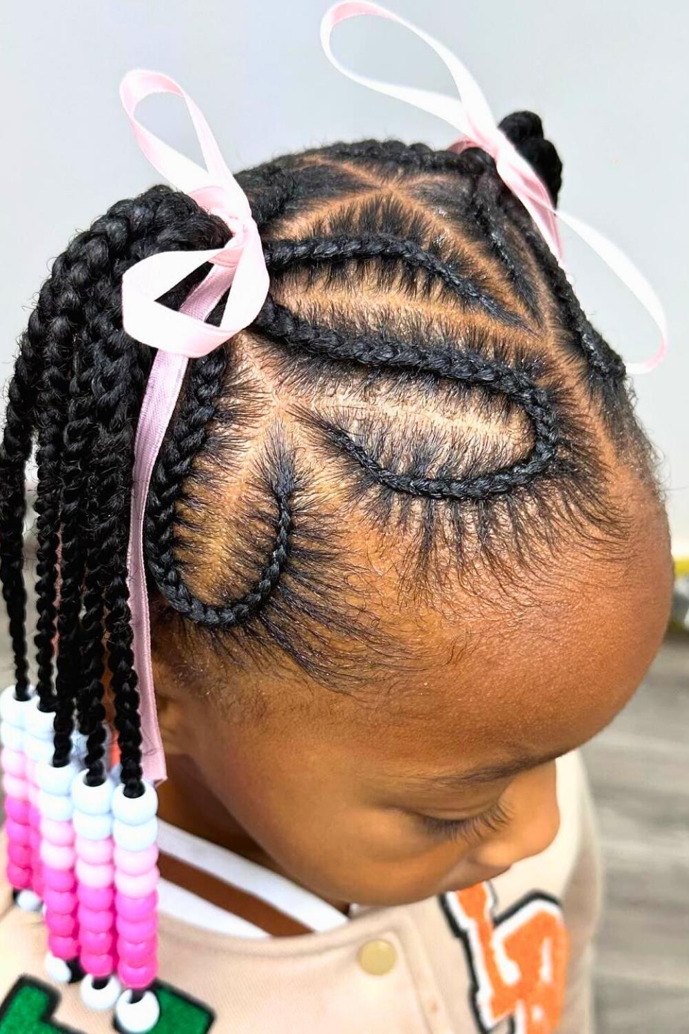Credit: @kidshairbyriGraduated lengths of braids create a waterfall effect, with pink beads flowing from short to long sections. This dynamic style adds movement and dimension while protecting hair from environmental damage. Apply moisturizing leave-in spray before styling to maintain healthy shine and prevent dryness.