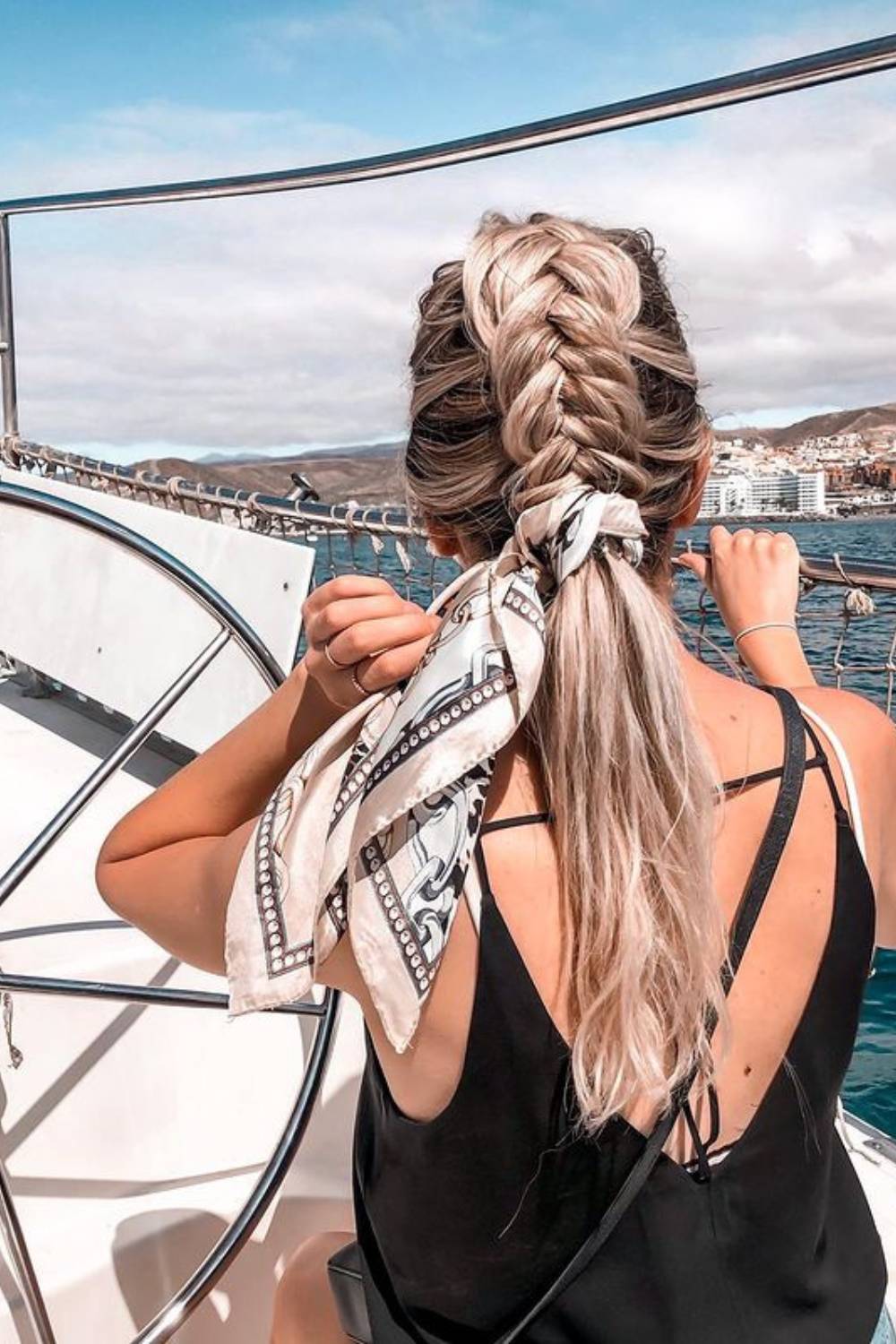The scarf disguises any greasiness at the roots. Choose bright colors for summer or earth tones for fall. This style screams European vacation vibes.