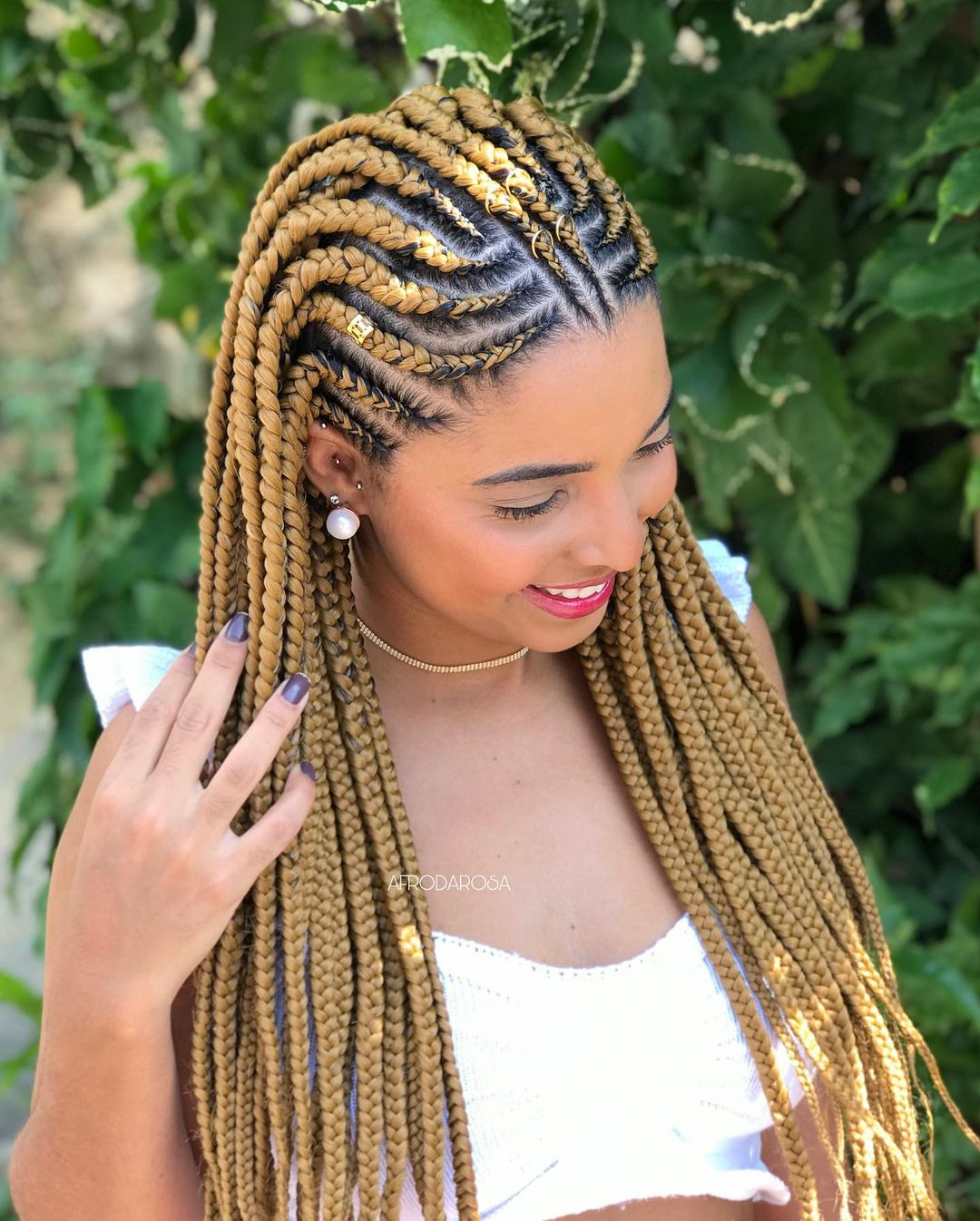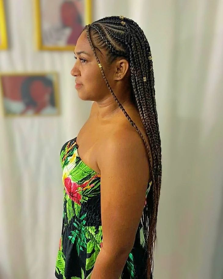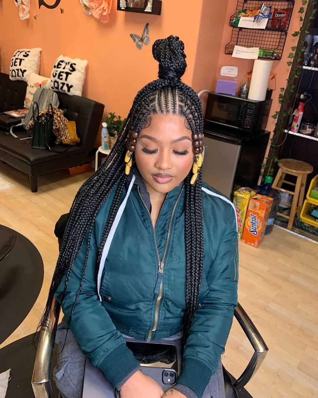 This is where tradition meets modern flair perfectly. You start with a geometric base pattern of cornrows, then transition into box braids adorned with colorful beads.