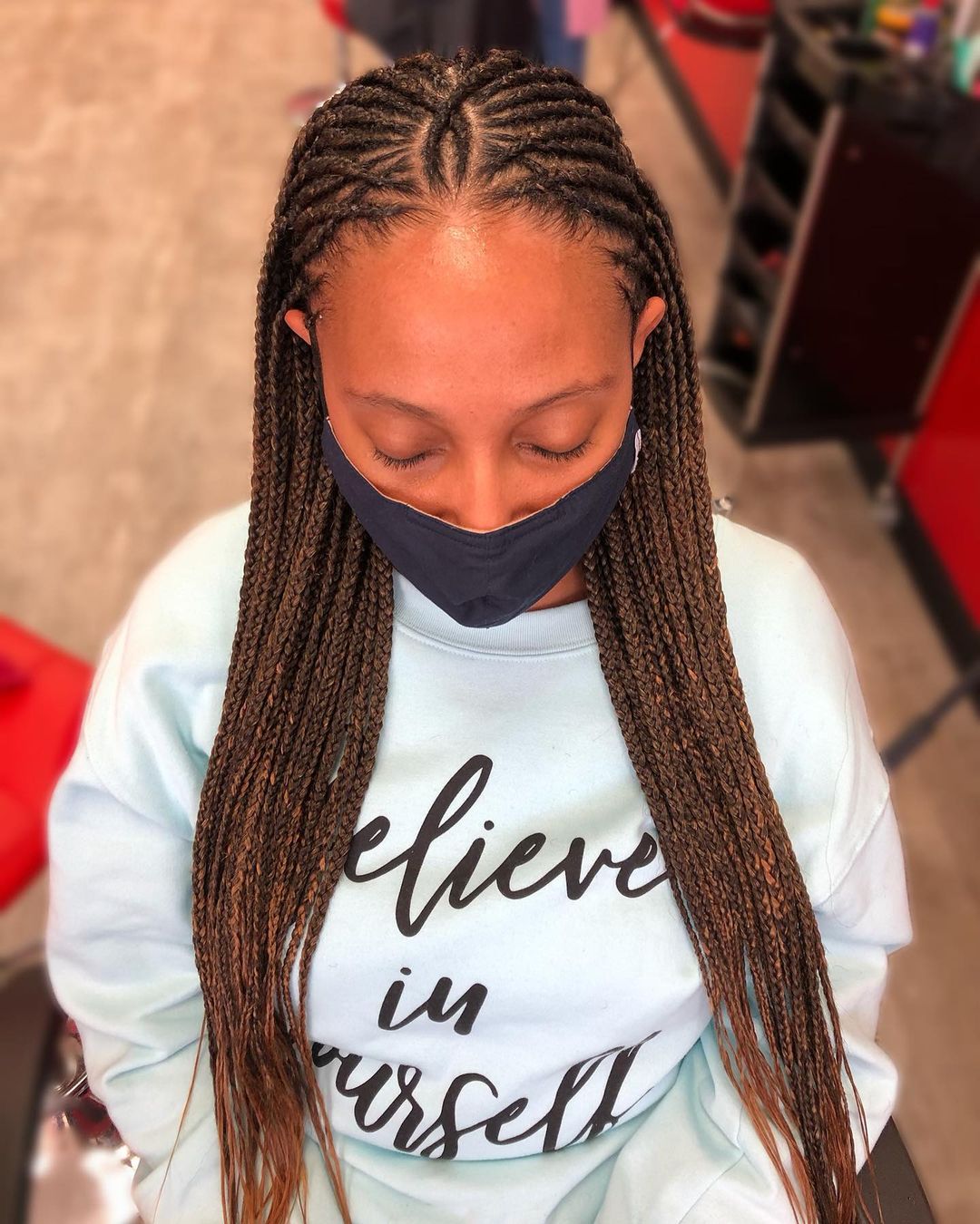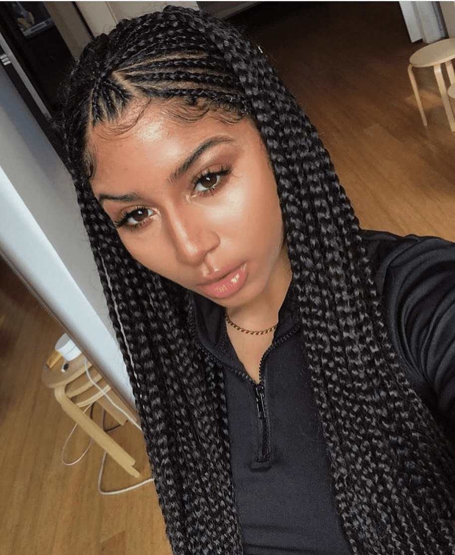 Think sleek, perfectly parted cornrows at the front that flow into long, uniform box braids. Everything about this screams polished and put-together.