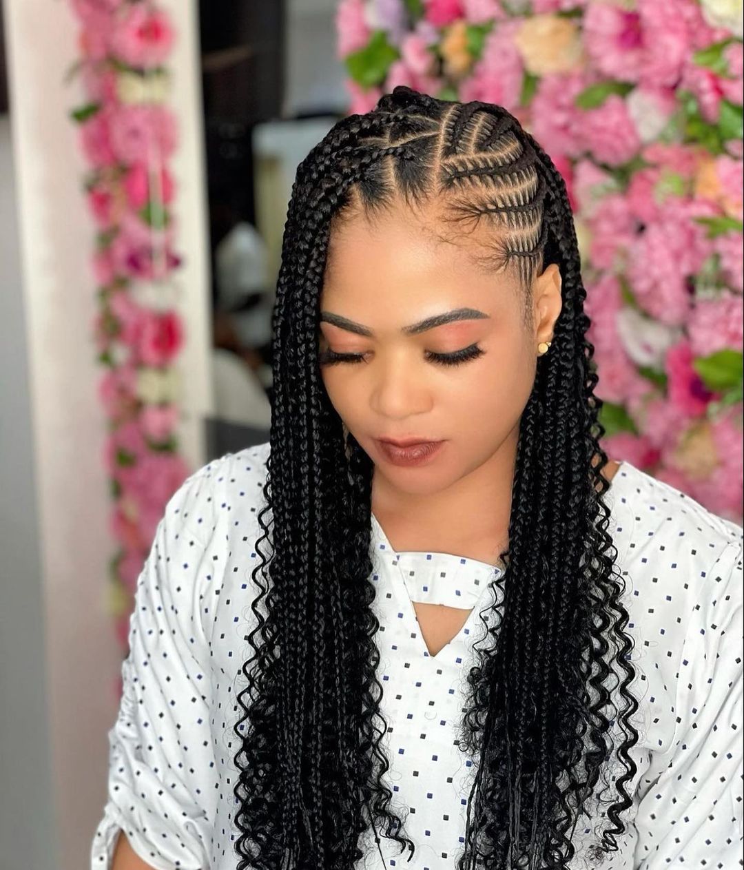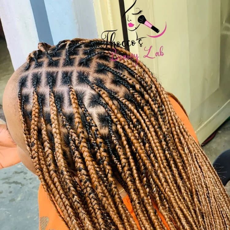 Triangular parts create this amazing geometric pattern across your scalp that's like wearing art on your head. Each triangle section flows into a beautiful knotless braid, and the overall effect is absolutely mesmerizing.