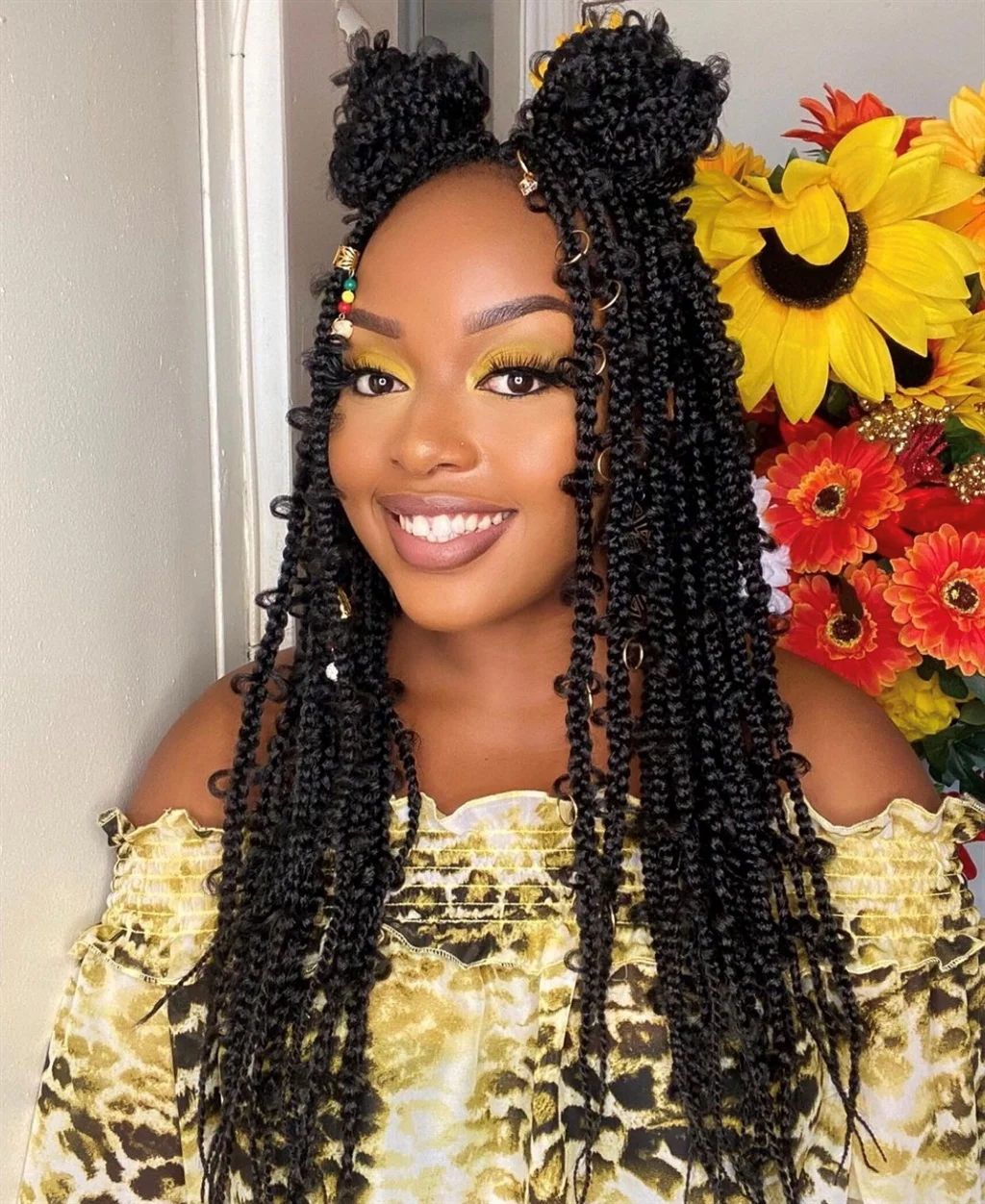 Bohemian vibes meet protective styling in this gorgeous, free-spirited look. Think medium knotless braids with intentionally messy, textured ends and maybe some decorative beads or rings scattered throughout.