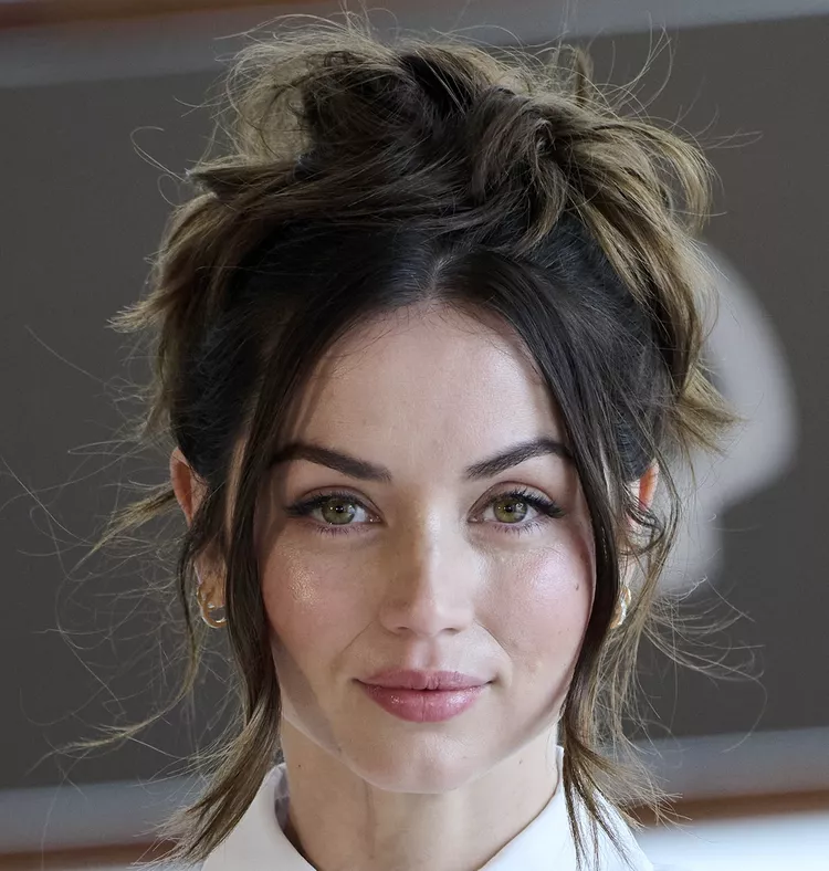 The casual, undone quality adds softness while the height created by the bun flatters round face shapes beautifully.