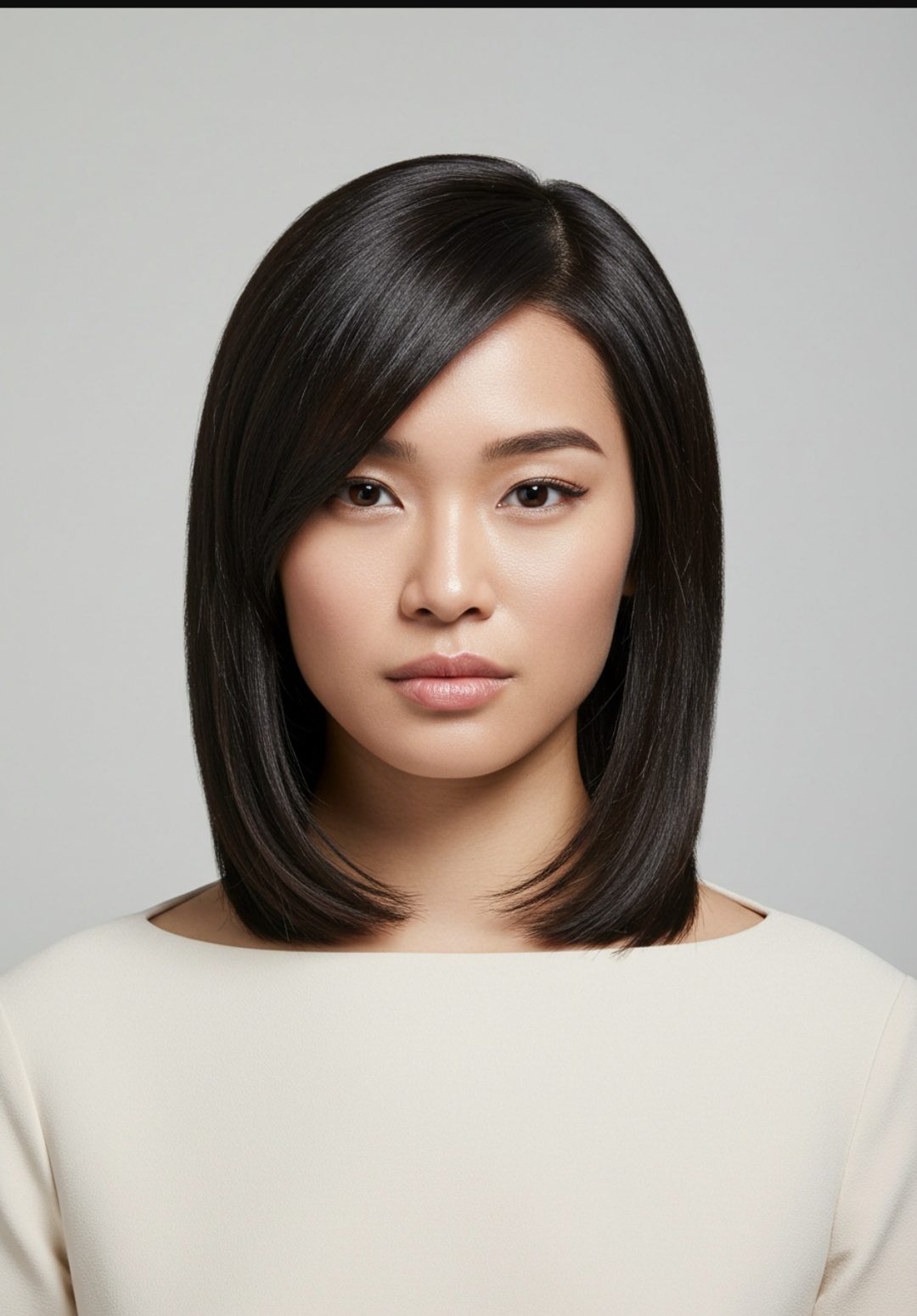 The deep side part creates dramatic asymmetry while the curved ends soften the jawline beautifully.