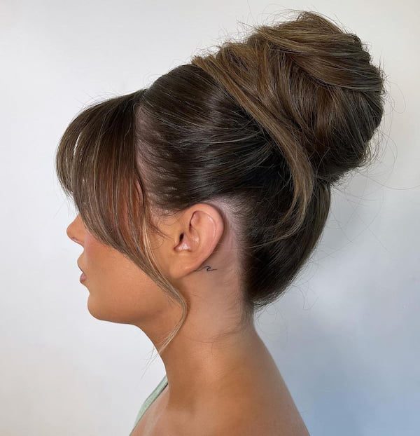 The classic chignon gets a modern twist with soft, face-framing bangs that add instant sophistication.