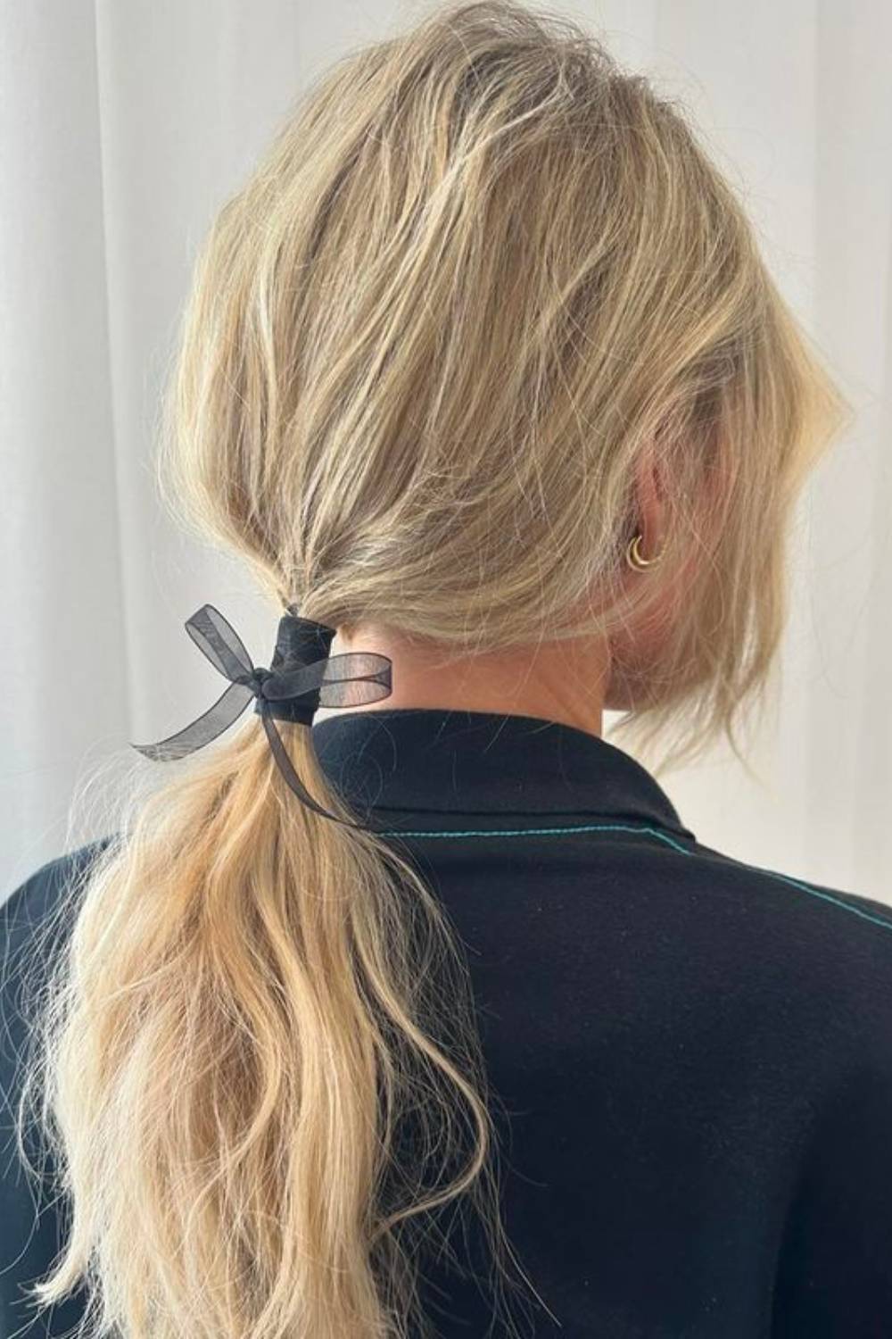 Add a touch of whimsy to your casual ponytail by incorporating a silk ribbon that complements your outfit perfectly.