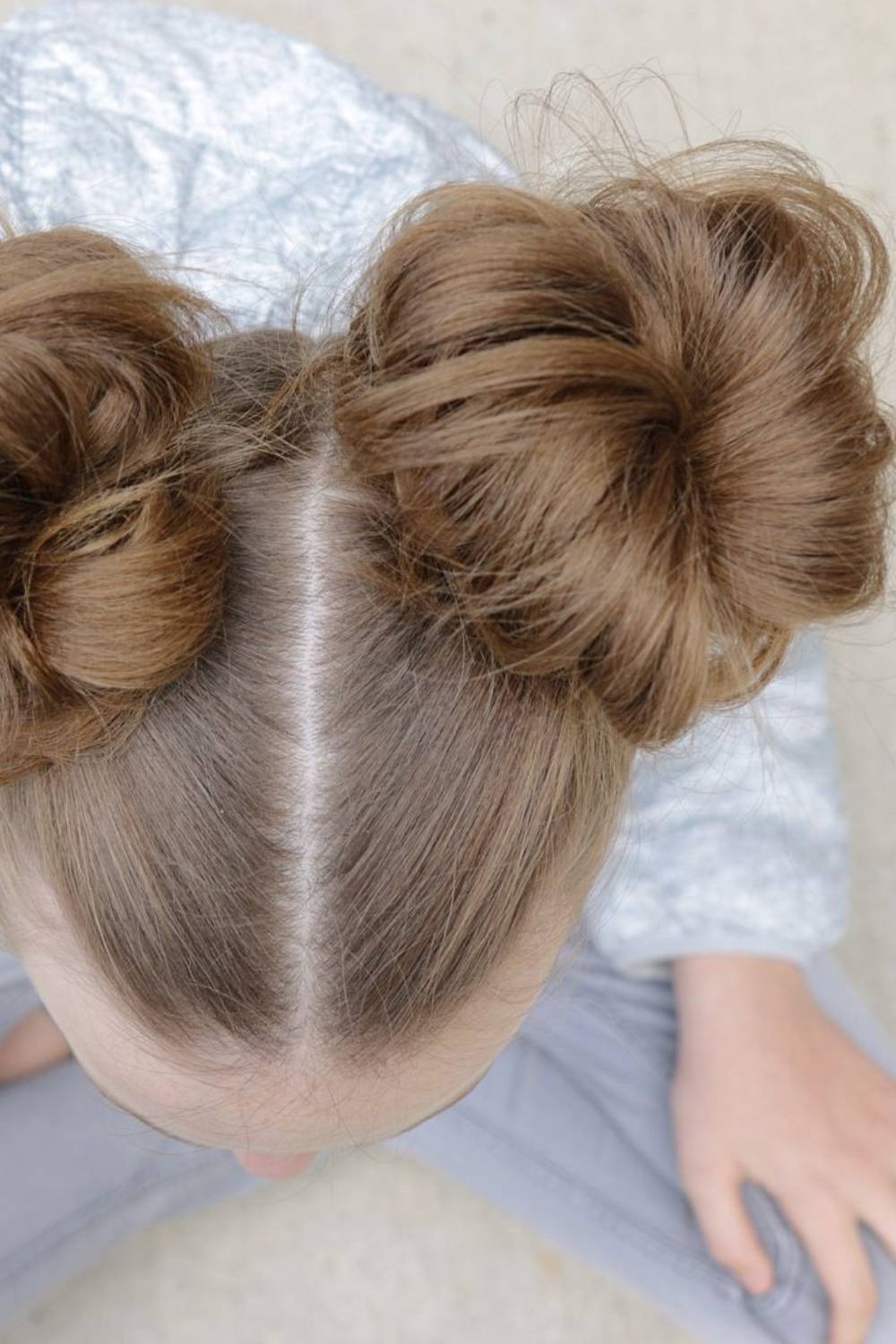 Part hair down the middle, then create two messy buns positioned high on each side of your head.