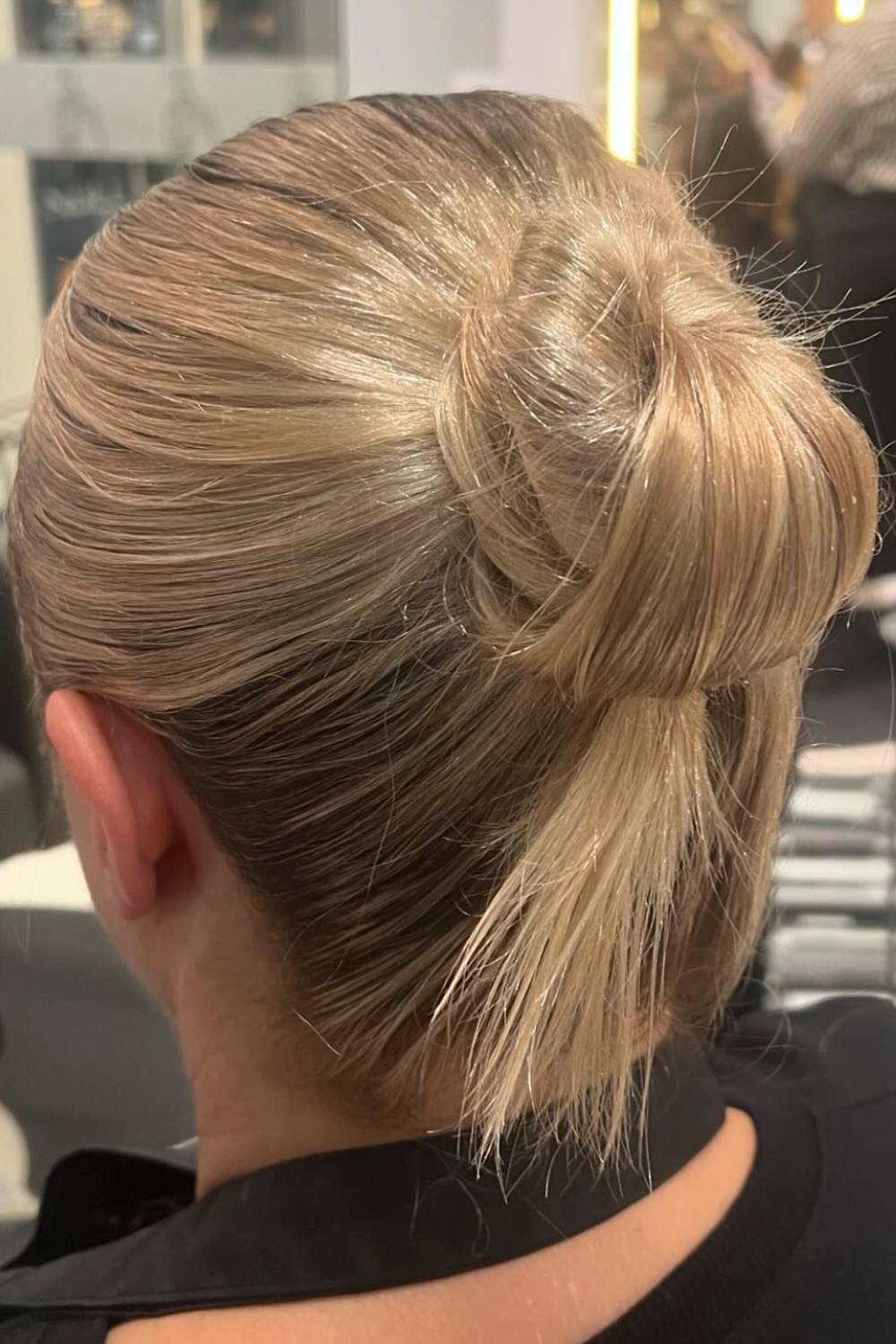 Make a statement with this modern top knot that sits high on your head like a perfectly sculpted crown.